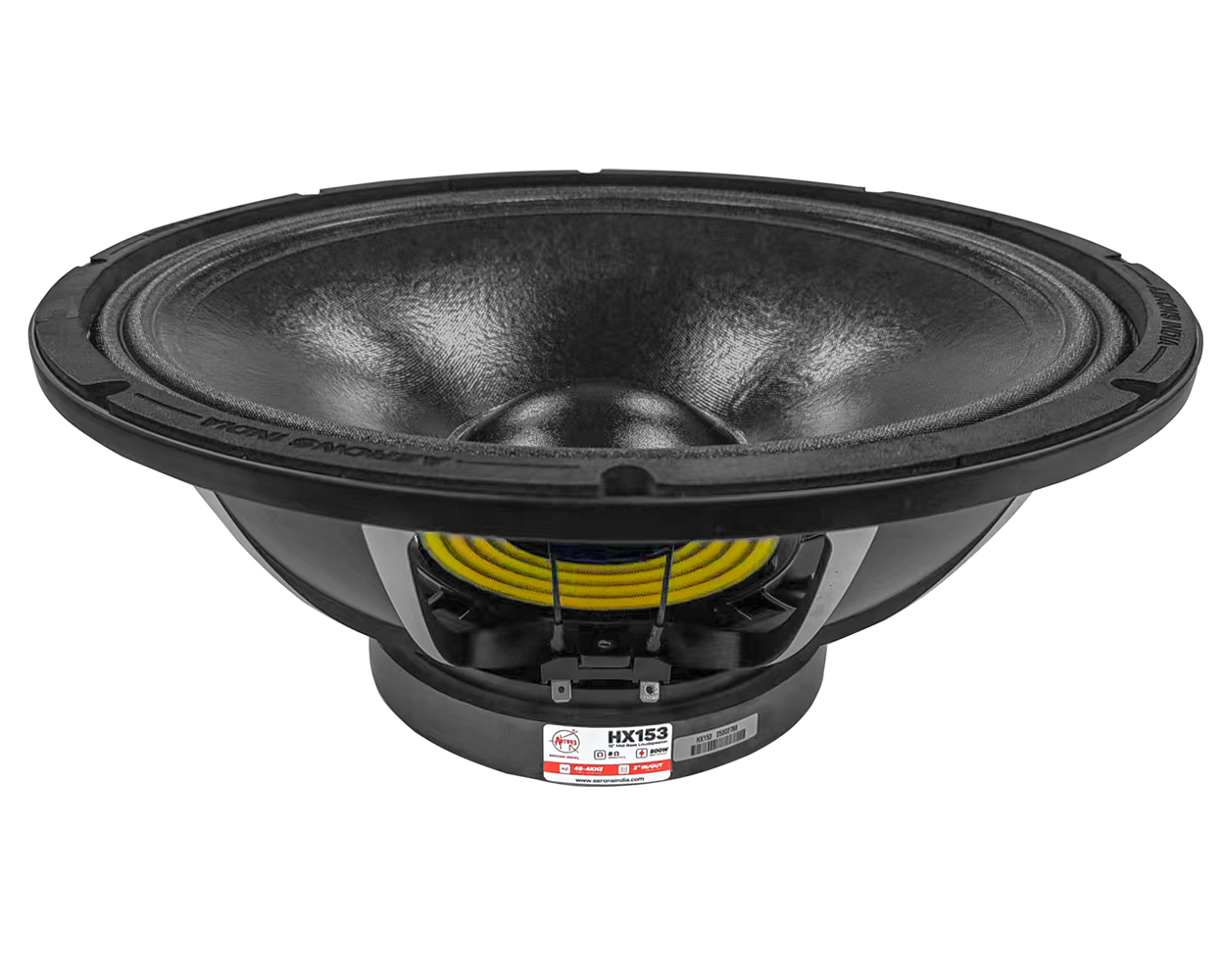 The AERONS HX153 is a premium 15-inch mid driver engineered for clean, accurate and expressive mid-range performance. Designed with an exclusive heavy-duty chassis, it offers long-term reliability for professional PA applications. Delivering 500W RMS power and a wide 46Hz–4kHz frequency range, it ensures clear mids and natural, detailed vocals. The 3-inch in/out voice coil provides excellent heat management and stable operation, while the 8-ohm impedance ensures easy amplifier compatibility. The HX153 is an ideal choice for users who want smooth, focused mids and superior vocal clarity in their sound systems.