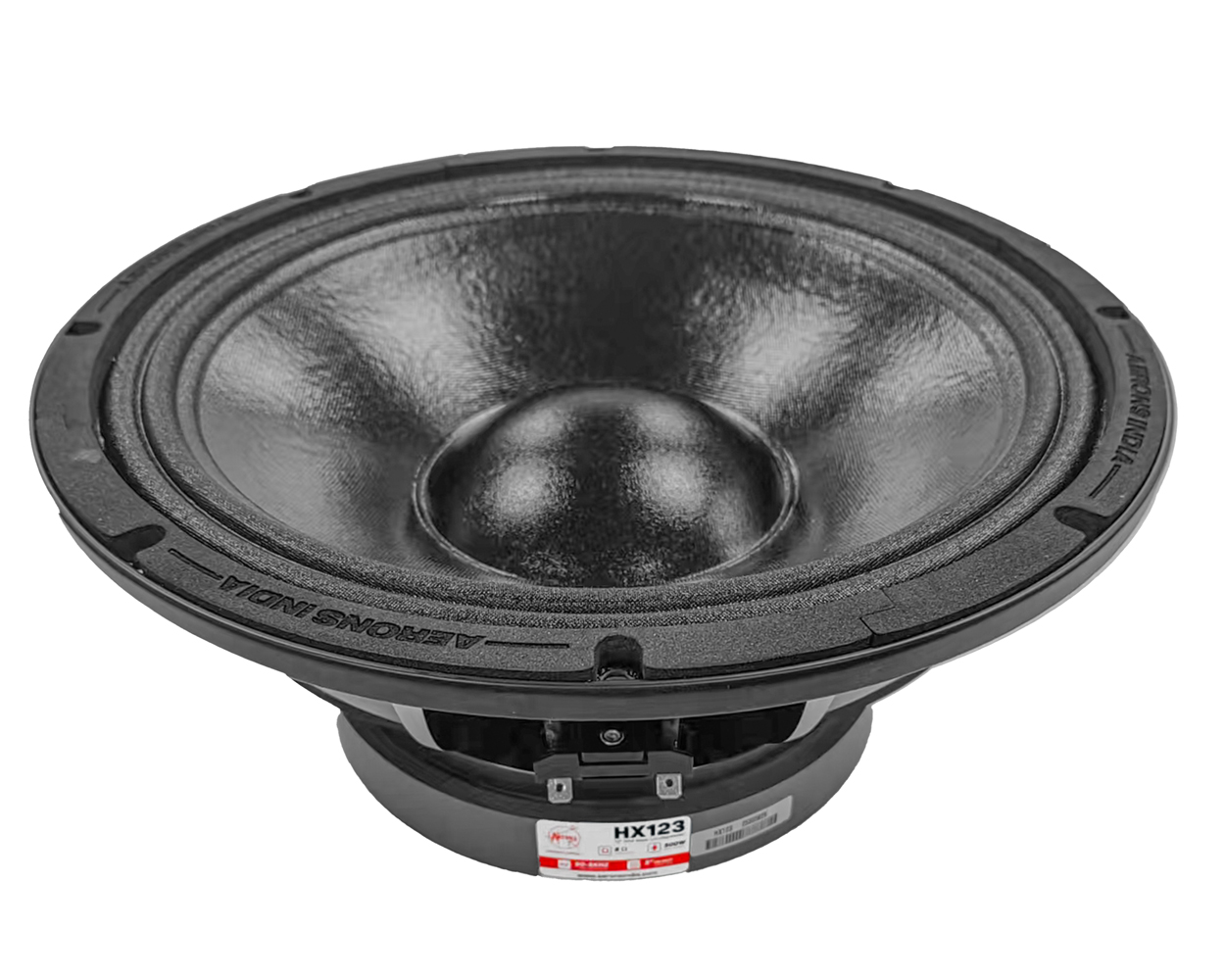 The AERONS HX123 is a high-performance 12-inch mid loudspeaker crafted for clear, detailed and natural mid-range output. Built with an exclusive heavy-duty chassis, it ensures strong durability and stable performance even in continuous use. Delivering 500W RMS power, the HX123 covers a wide 50Hz–5kHz frequency range, making it ideal for rich mids and smooth, expressive vocals. Its 3-inch in/out voice coil provides excellent heat handling, while the 8-ohm impedance ensures broad amplifier compatibility. The HX123 is a reliable choice for professional PA systems requiring clean mid clarity and consistent sound quality.